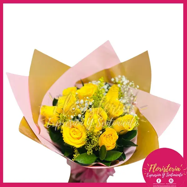 - Bouquet 12 Rosas Amarillas, Tradicional, Mariposa, Papel Coreano.