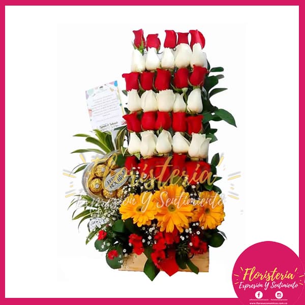 Escaleras de Rosas Blancas y Rojas mas Chocolates Ferrero