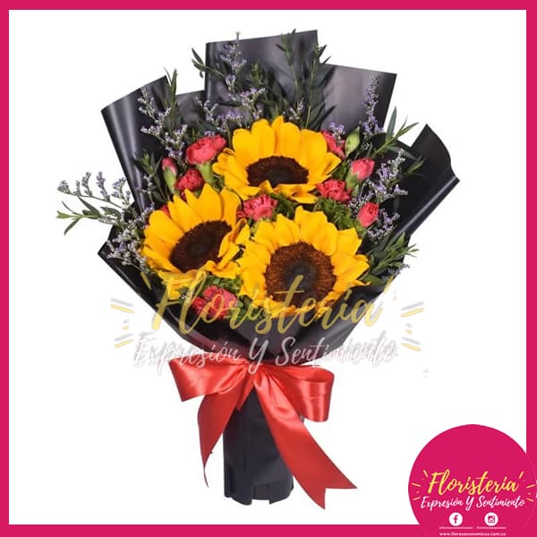 En Floristería Expresión & Sentimiento encontraras los mejores detalles para regalar en cualquier momento para esa persona que amas. Hermosos ramos florales con envíos gratis en la zona urbana de Villavicencio. | Hermoso Bouquet de 3 Girasoles y Clavellina