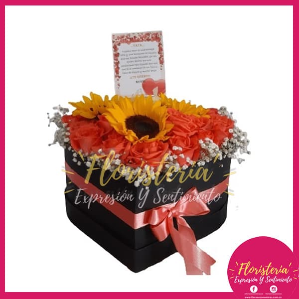 En Floristería Expresión & Sentimiento encontraras los mejores detalles para regalar en cualquier momento para esa persona que amas. Hermosos ramos florales con envíos gratis en la zona urbana de Villavicencio. | Caja de Corazón Girasoles y Rosas
