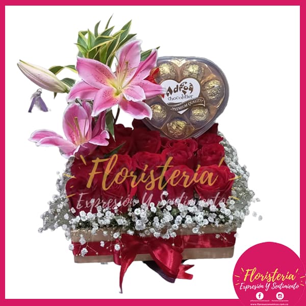 Caja de madera rosas rojas lirios y chocolate Ferrero Corazon