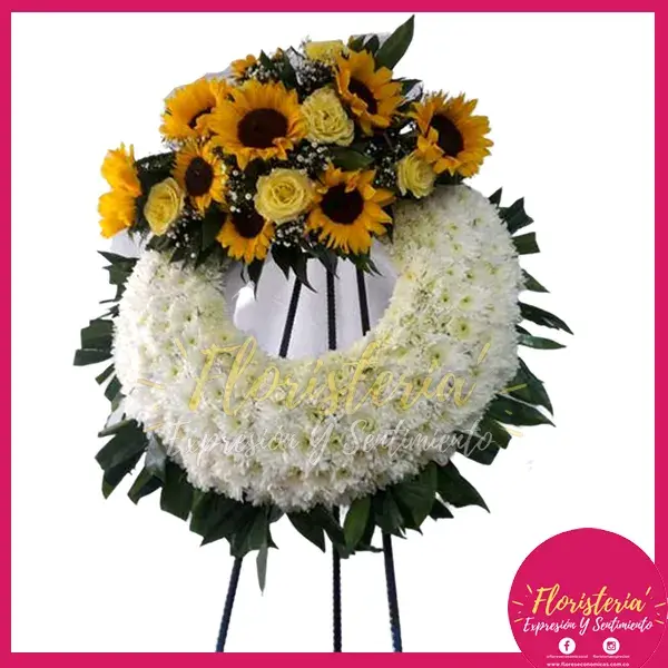- Corona diseñó en flores blancas y moño en girasoles y rosas amarillas